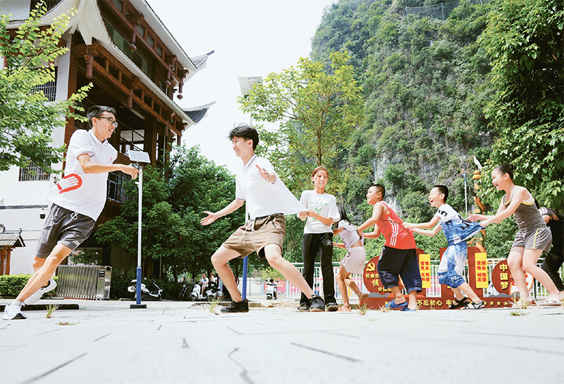 图为2023年8月13日,在广西柳州融水苗族自治县易地扶贫搬迁安置点苗家小镇社区,西北大学研究生支教团志愿者开展暑期志愿服务活动,为留守儿童和其他孩子提供家教、游戏和阅读等服务,让孩子们度过快乐充实的暑假。 人民图片 龙涛/摄